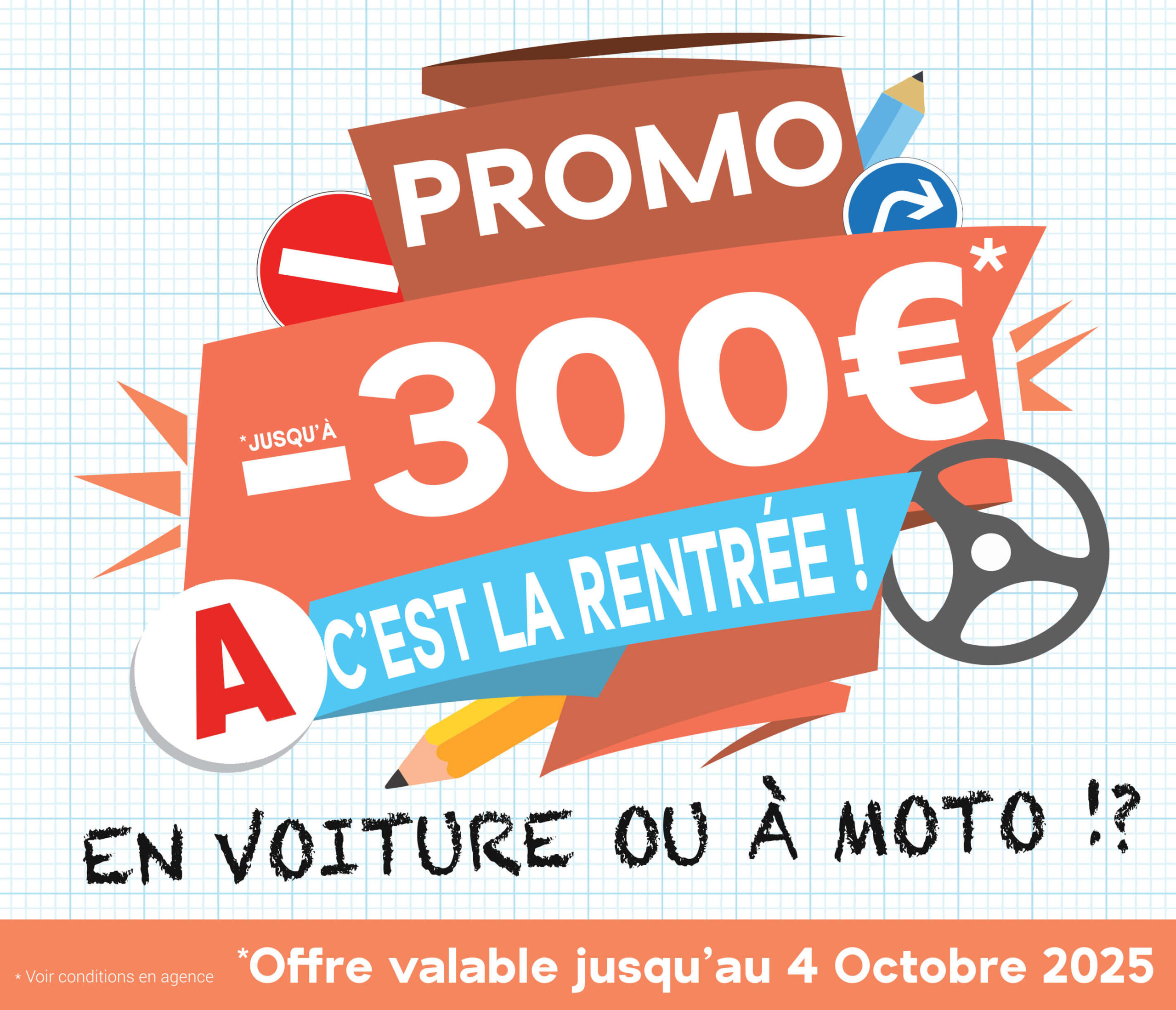 (1) Evaluation départ voiture & 2 roues : Une évaluation d’une durée d’environ 50 minutes doit obligatoirement être effectuée avant toute souscription d’un forfait. Elle permettra d’estimer (sans caractère définitif) le nombre d’heures de formation pratique en vue de la signature du contrat de formation. Voiture : Cette évaluation est réalisée à l’aide d’un simulateur de conduite dernière génération. Pour les personnes à mobilité réduite, l’évaluation de départ sera réalisée en voiture avec un(e) enseignant(e). 2 roues : Cette évaluation est réalisée à l’aide d’une tablette.